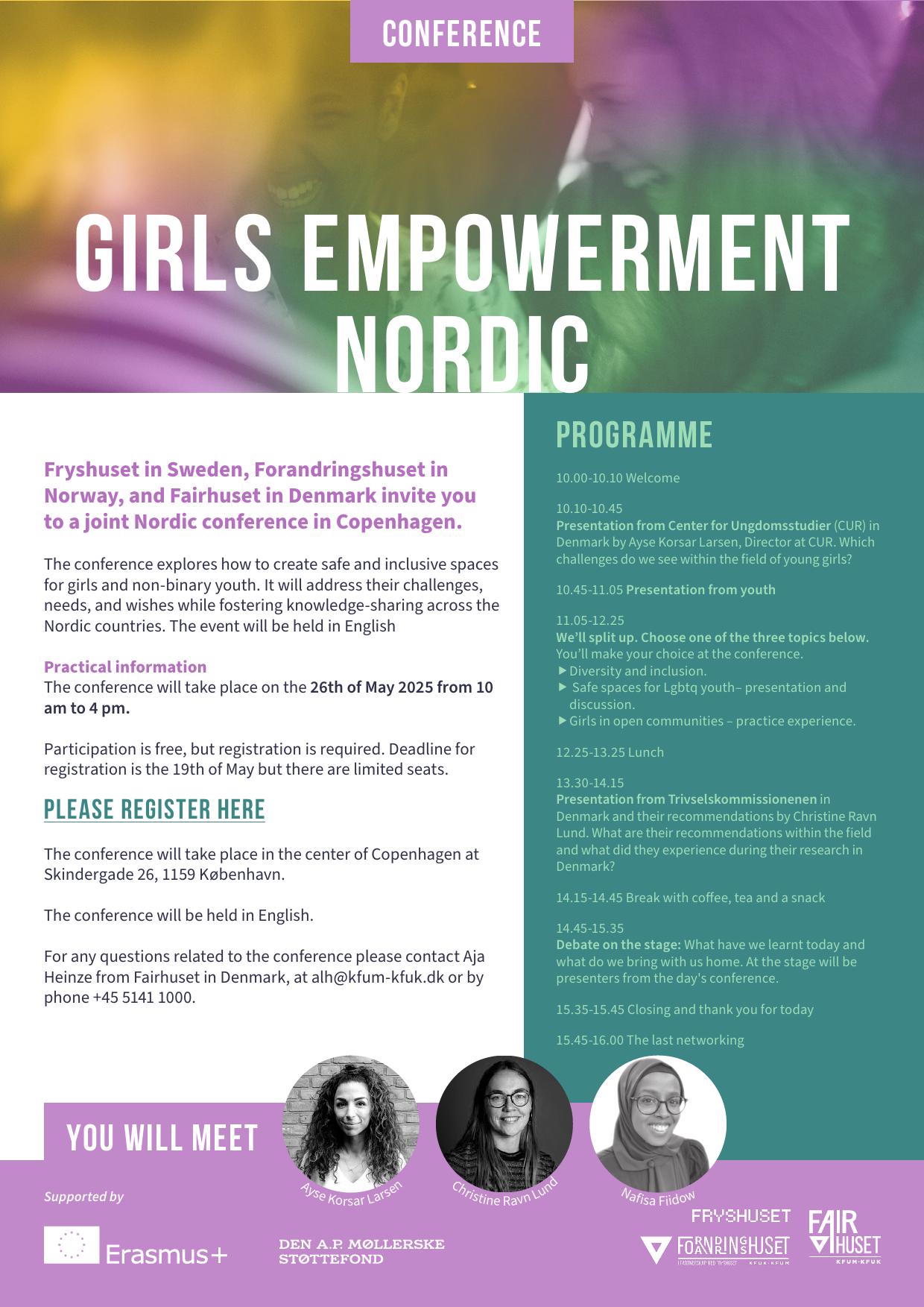 Den 26. maj afholder Fairhuset i samarbejde med Fryshuset i Sverige og Forandringshuset i Norge en fælles nordisk konference om trygge fritidsfællesskaber for piger og ikke-binære. Kom og vær med!